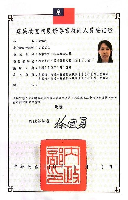 - 建築物室內設計乙級(負責空間設計,也可申辦簡易裝修許可)